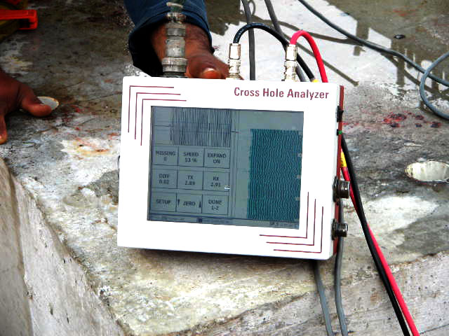 Las pilas son preparadas para la prueba durante su construcción, instalando tubos de 2 pulgadas de diámetro interior, que son fijados al acero de refuerzo a lo largo de la longitud total de la pila.